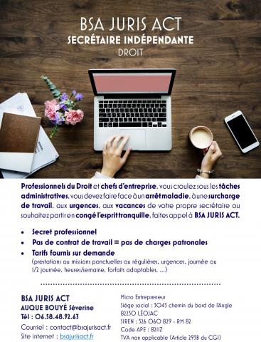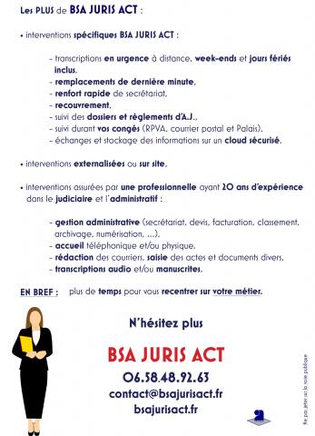 vous croulez sous les tâches administratives, vous devez faire face à un arrêt maladie, à une surcharge de travail, aux urgences, aux vacances de votre propre secrétaire ou souhaitez partir en congé l’esprit tranquille, faites appel à BSA JURIS ACT.